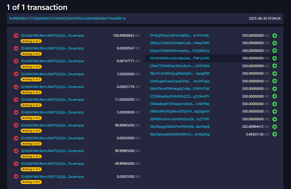 The country transferred 6,274 BTC — roughly $678 million at current prices — out of a single address and into 14 separate addresses, with each new address holding up to 500 BTC.