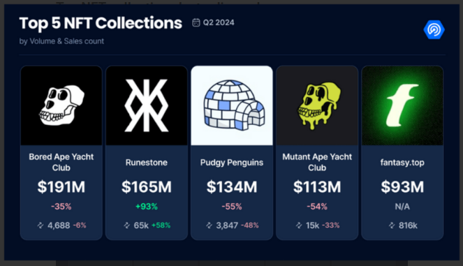 Runes, on the other hand, is a protocol enabling the creation of memecoins on Bitcoin. This playful twist on traditional finance has captured the imagination of collectors, with the Runestones collection experiencing a staggering 93% growth in Q2. The rise of memecoins within the NFT space injects a dose of fun and virality, potentially attracting new demographics to the market.