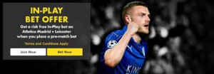Risk free bet will be deemed your first single bet placed In-Play on the Atletico Madrid v Leicester Champions League match, played on Wednesday 12th April 2017. If your first single In-Play bet is fully or partly Cashed Out, or edited using our Edit Bet feature, you will no longer be eligible to receive this offer.